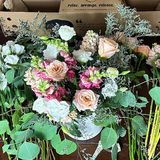 🌸 Start with a few small-to-medium blooms (think spray roses, waxflower, or a bold dahlia for drama).