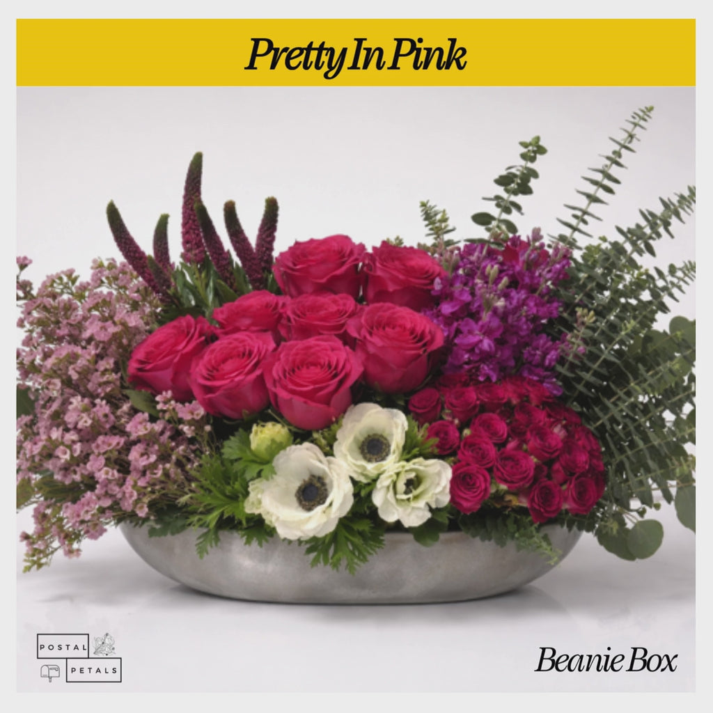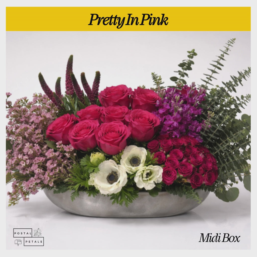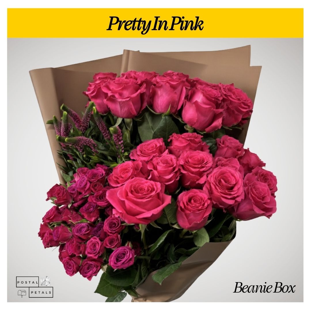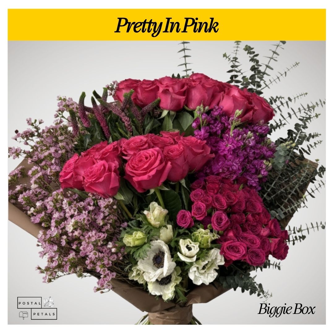 Pretty In Pink - Midi Box comes with everything listed in the Beanie Box, plus one bunch each of Anemones, Stock, and Waxflower