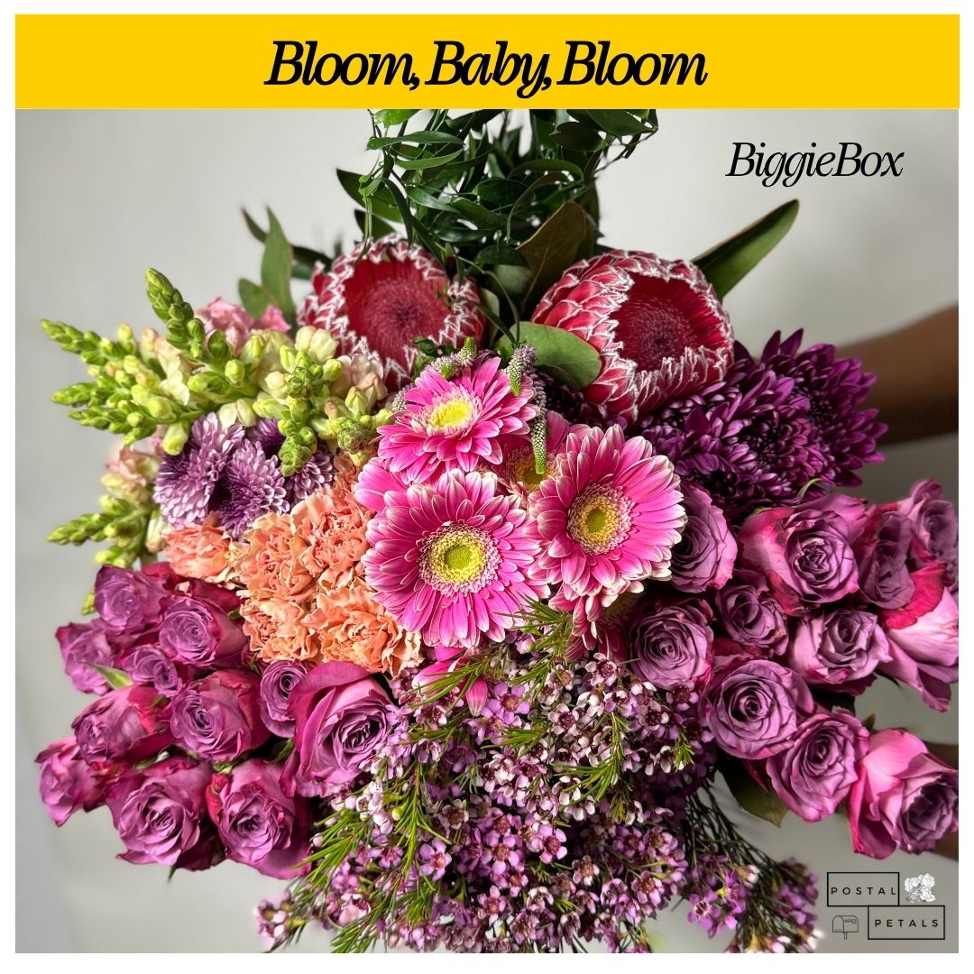 Say hello to Bloom, Baby, Bloom, a vibrant DIY Bloom Box with Roses, Carnations, Gerberas, Empress Protea, Snapdragons, and more, creating a bold and beautiful display.