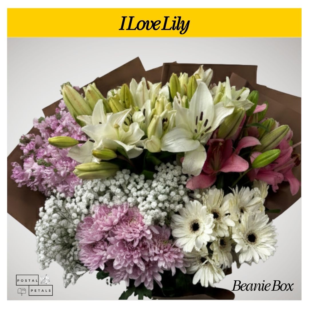 I Love Lily - Beanie Box comes with two bunches of Rose Lily, plus one bunch each of Stock, Cremons, Mini Gerbera Daisies, and Baby’s Breath