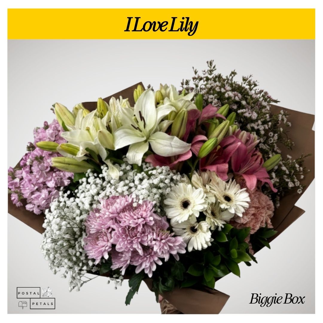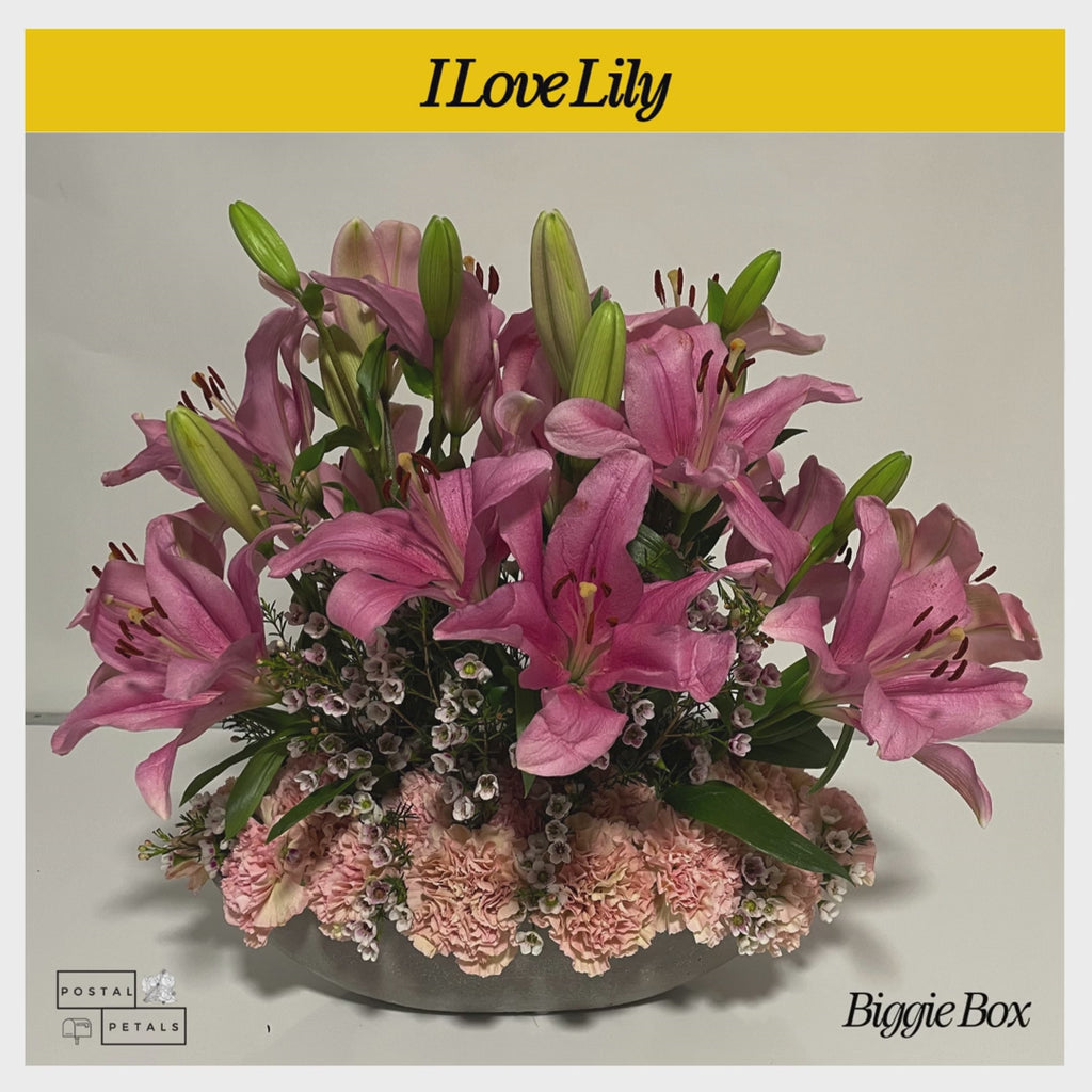 I Love Lily - Biggie Box comes with everything listed in the Midi Box, plus two dozen Carnations, and one bunch of Waxflower