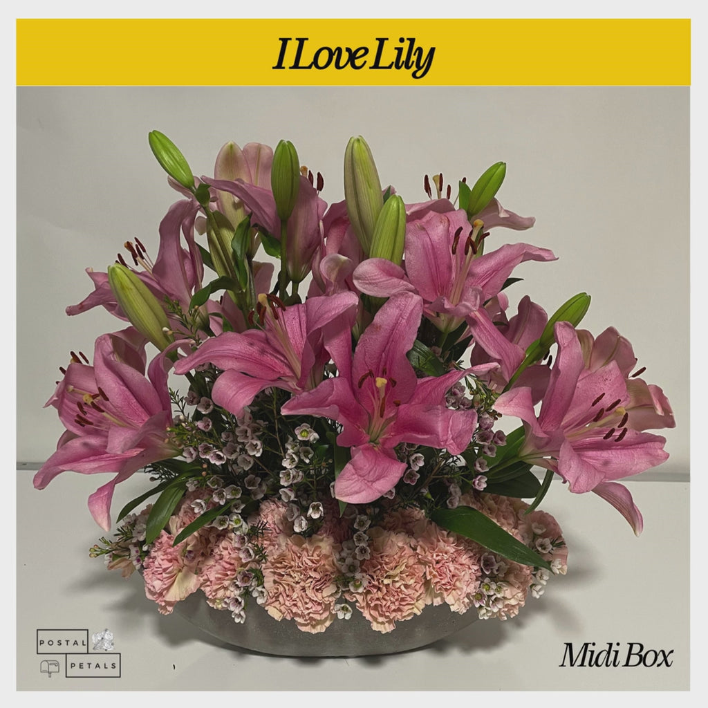 I Love Lily - Midi Box comes with everything listed in the Beanie Box, plus two bunches of Rose Lily and one bunch of Ruscus Israeli