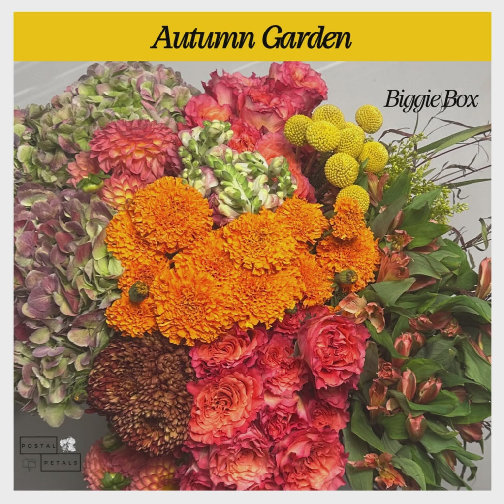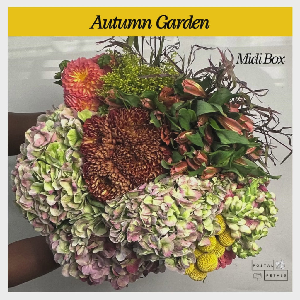 Autumn Garden - Midi Box comes with everything listed in the Beanie Box, plus one bunch each of Billy Balls, Alstroemeria, and Solidago