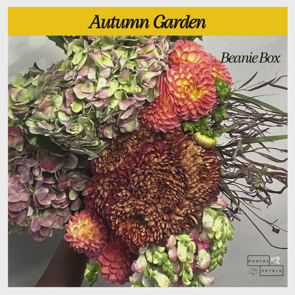 Autumn Garden - Beanie Box comes with 2 bunches of Dahlia and one bunch each of Hydrangea Jumbo, Disbud Ball, Snapdragon, and Agonis