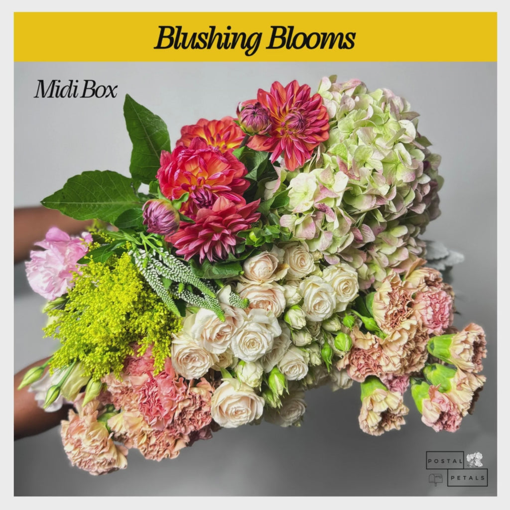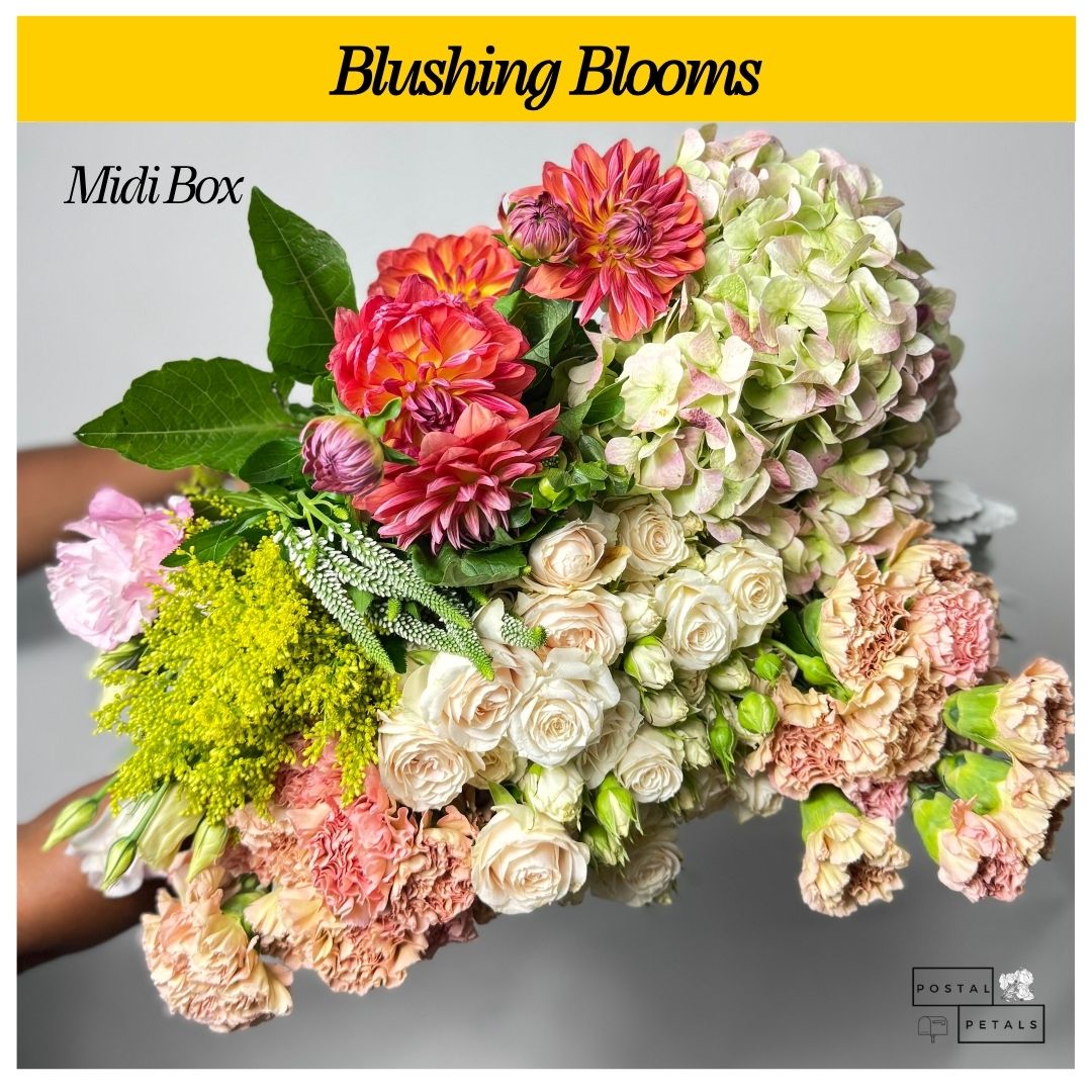 Blushing Blooms - Midi Box comes with everything listed in the Beanie Box, plus one bunch each of Solidago, Dahlias, and Veronica