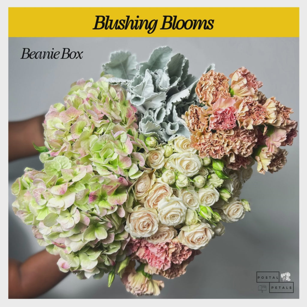 Blushing Blooms - Beanie Box comes with two dozen Carnations and one bunch each of Jumbo Hydrangea, Lisianthus, Dusty Miller, and Spray Roses