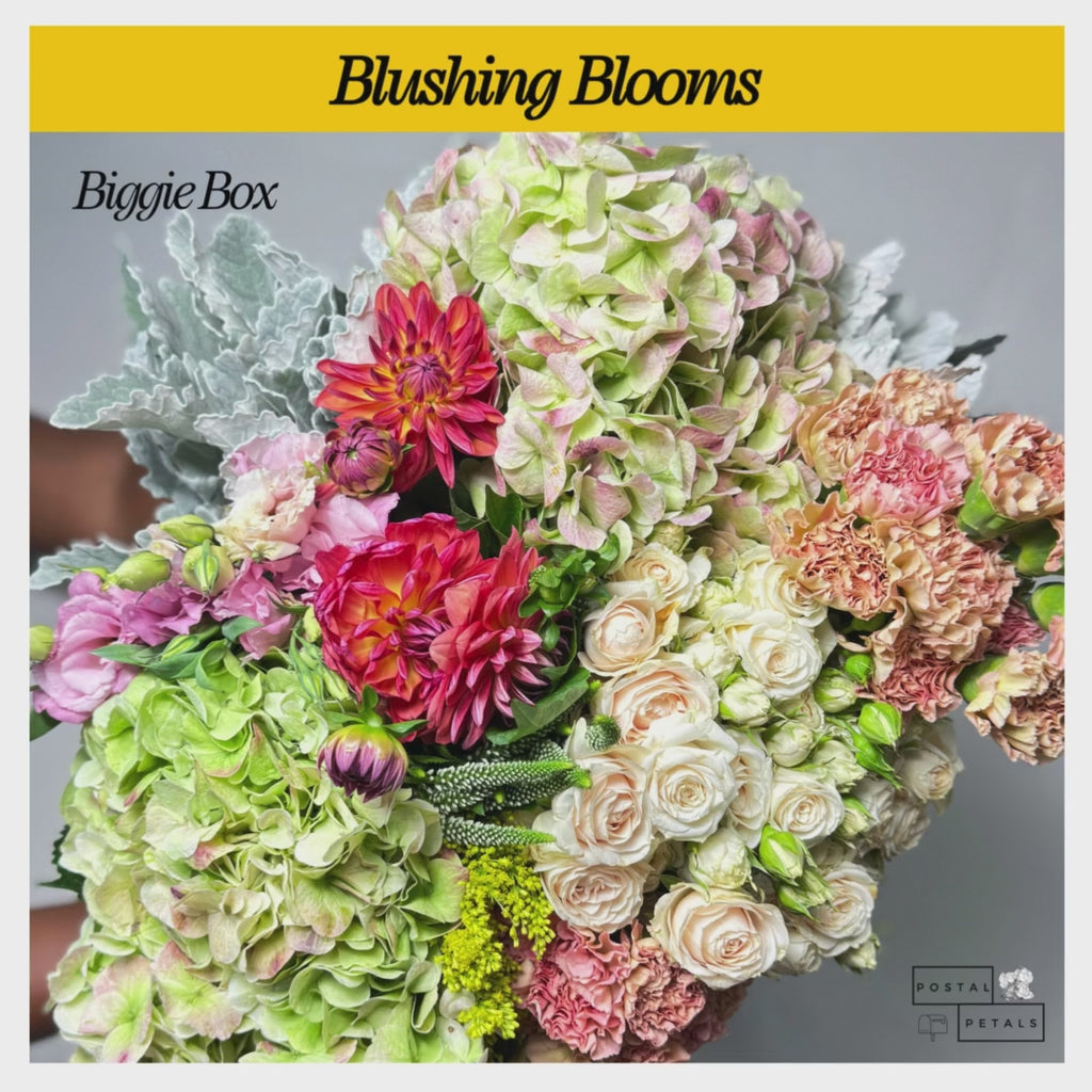 Blushing Blooms - Biggie Box comes with everything listed in the Midi Box, plus one bunch each of Jumbo Hydrangea, Lisianthus, and Dusty Miller